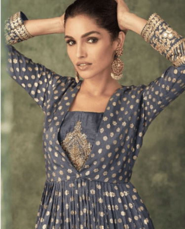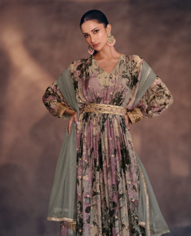 Grey Flared Georgette Anarkali Gown with Dupatta