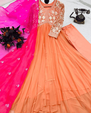 Dark Peach Faux Georgette Embroidery Work Eid Wear Gown With Dupatta