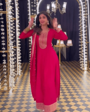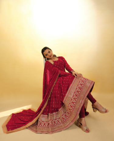 Red Colour Embellished Flared Kurta & Pants with Dupatta
