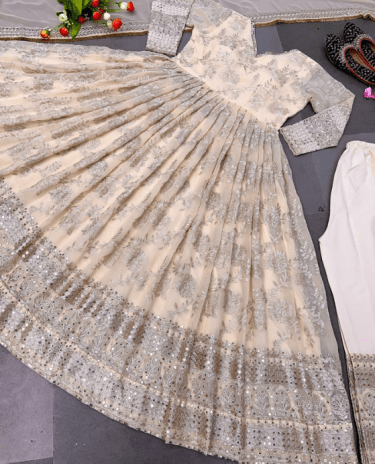 Cream Embroidered Georgette Gown with Dupatta