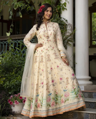 Cream Premium Silk Gown with Dupatta Set
