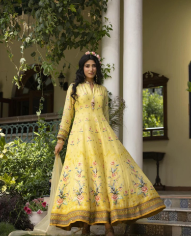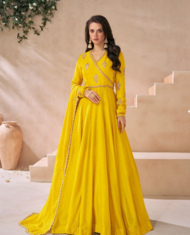 Yellow Premium Silk Gown with Dupatta Set