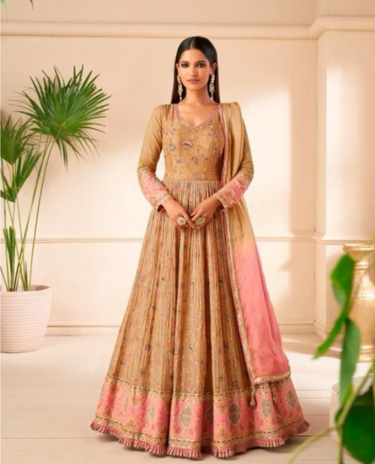 Beige Floral Embroidered Chinon Silk Anarkali Gown