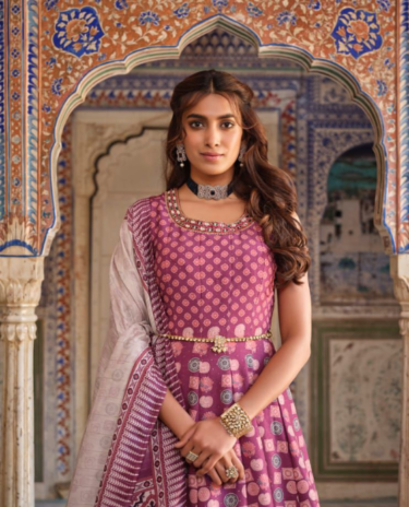 Pink-to- Magenta Coloured Foil Printed Faux Georgetta Gown with Dupatta