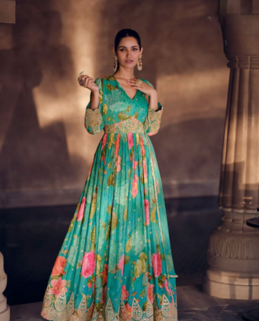 Teal Green Real Chinon Colour Digital Print Flared Gown with Dupatta
