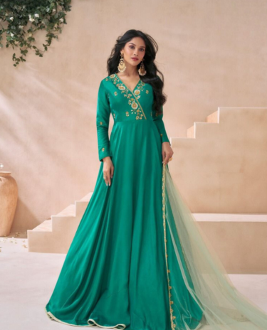 Dark Green Premium Silk Gown with Dupatta Set