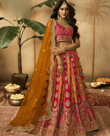 Wedding Special:Pink and Yellow Color Banarasi Silk Lehenga