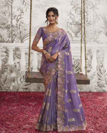 Purple Soft Woven Embroidery Designer silk Saree With Matching Floral work blouse
