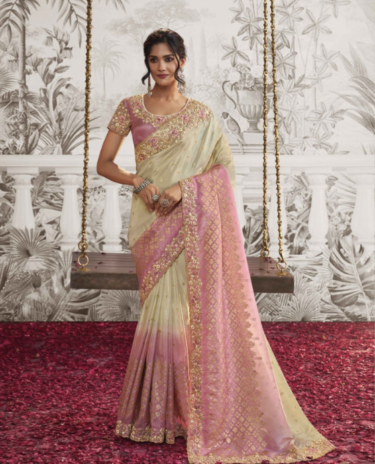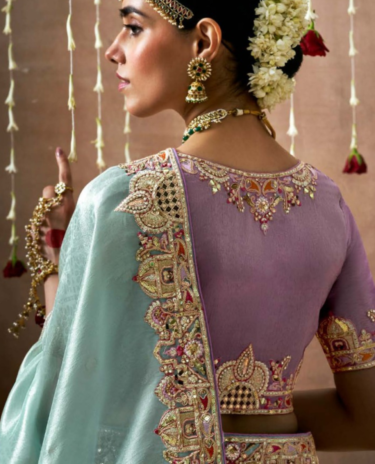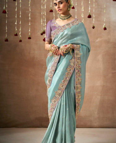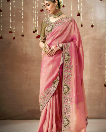 Dual Shade Tissue Zari Saree with Olive Green Embroidered Border & Silk Blouse