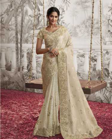 Off White Tissue Contemporary Saree Wedding Wear Beads Work Saree With Blouse