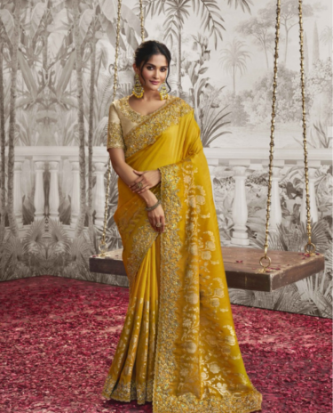 Mustard Colour Embroidered Silk Traditional Partywear Saree
