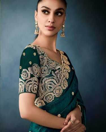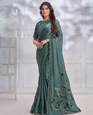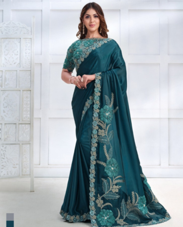 Teal Green Colour Embroidered Silk Traditional Partywear Saree