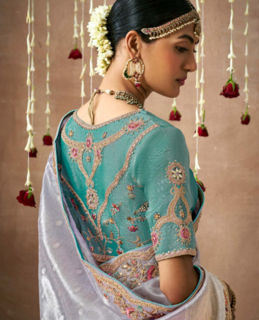 Stone Blue Soft Woven Embroidery Designer silk Saree With Matching Floral work blouse