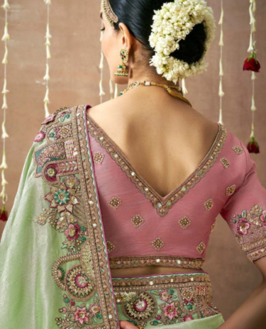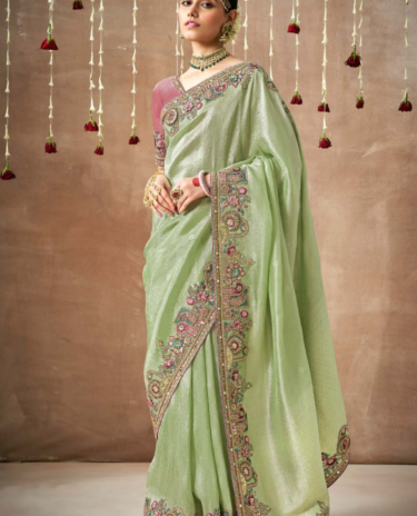 Light Green Colour Silk Hand Embroidered Stone And Beads Work Saree Wedding Wear