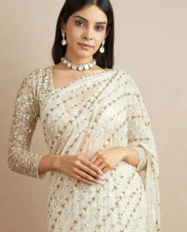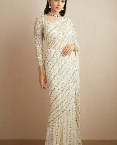 Cream Colour Premium Georgette Embellished With Beautiful , Zari , Embroidery, Sequins Work