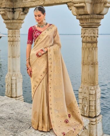 Beige colour Tissue Contemporary Saree Wedding Wear Beads Work Saree With Blouse