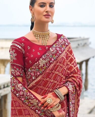 Dark Red Colour Embroidered Silk Traditional Partywear Saree