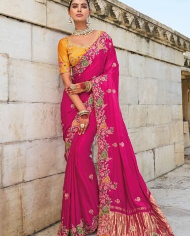 Magenta Colour Georgette Saree Embroidered Wedding Wear With Blouse