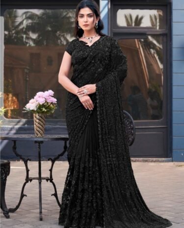 Butterfly Net Black Wedding Wear Beads Work Saree With Blouse
