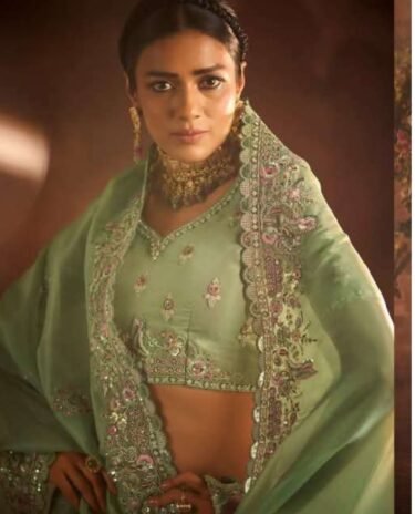 Olive Green Tissue Silk Fabric With Embroidery Stone Real Mirror Work