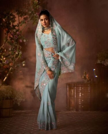 Sky Blue Colour Georgette Saree Embroidered Wedding Wear With Blouse