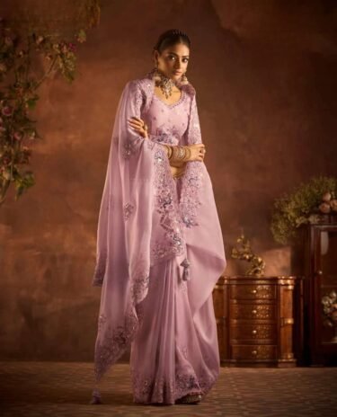 Dusty Lavedar Soft Woven Embroidery Designer silk Saree With Matching Floral work blouse