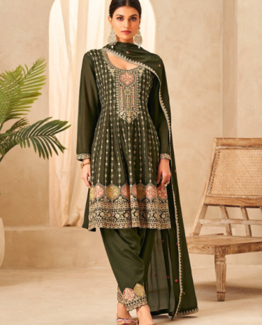 Dark Green Color Chinon Fabric Readymade Suit