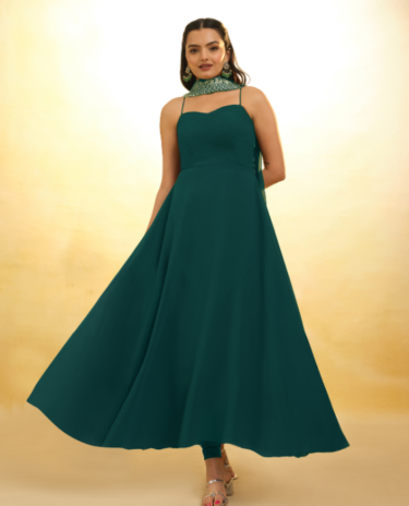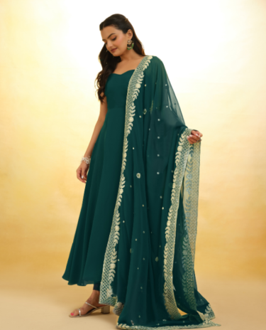 Dark Green Embroidered Faux Georgette Gown With Bottom and Dupatta