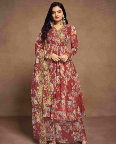 Red Net Floral Embroidery Suit In Sharara Style