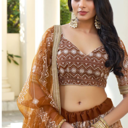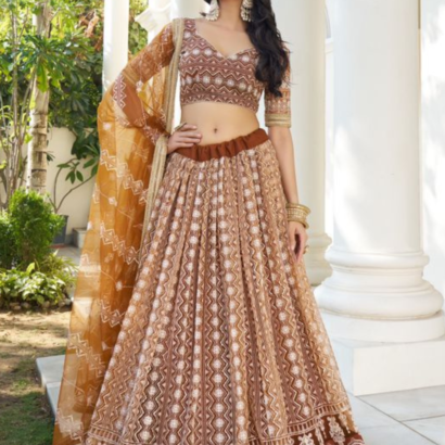 Brown Butterfly Net Embroidered Lehenga Choli