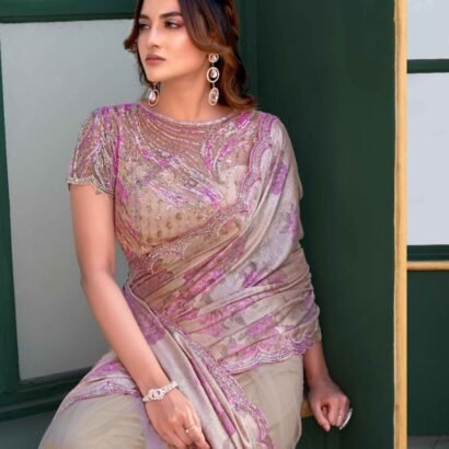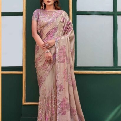 Butterfly Net beige Colour Wedding Wear Beads Work Saree With Blouse