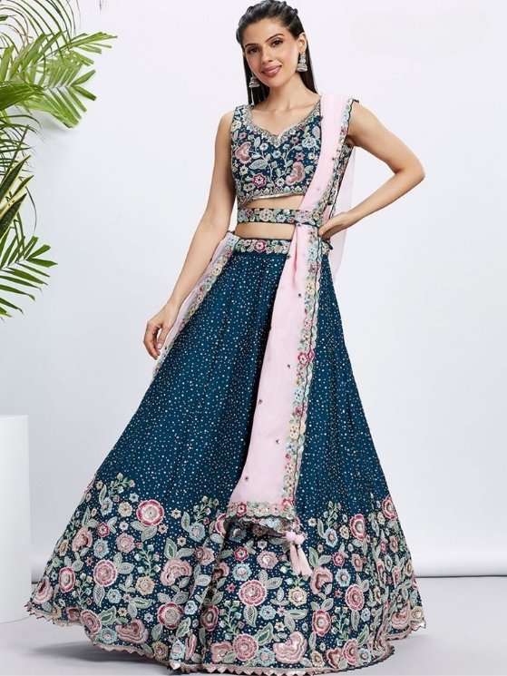 Dark Blue Georgette Sequined Wedding Wear Lehenga Choli