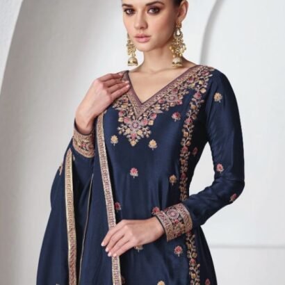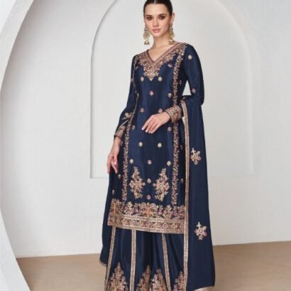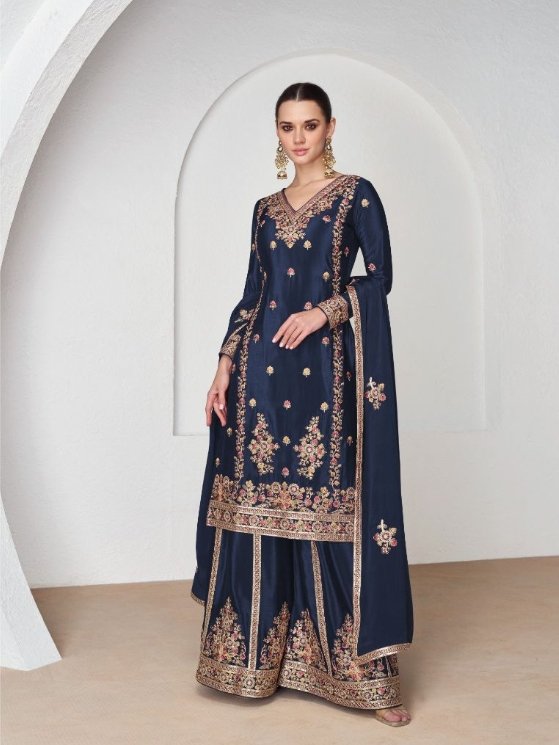 Dark Blue Premium Chinnon Silk Suit In Sharara Style