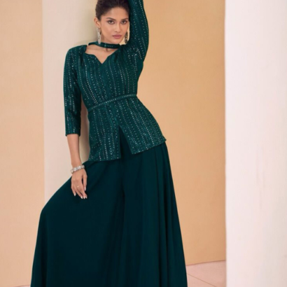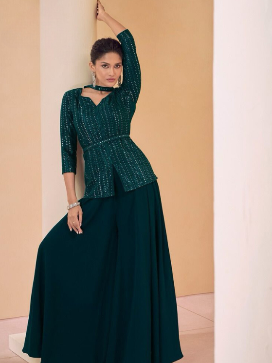 Dark Green Chinon Georgette Kurti Plazzo Shrug Set