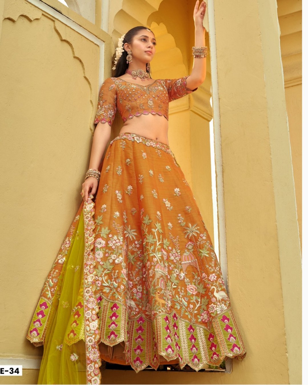 Dark Orange & Yellow Floral Embroidered Bridal Lehenga with Embroidered Bridal Lehenga thread work lehenga set