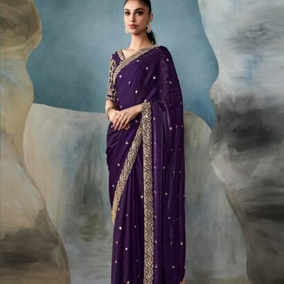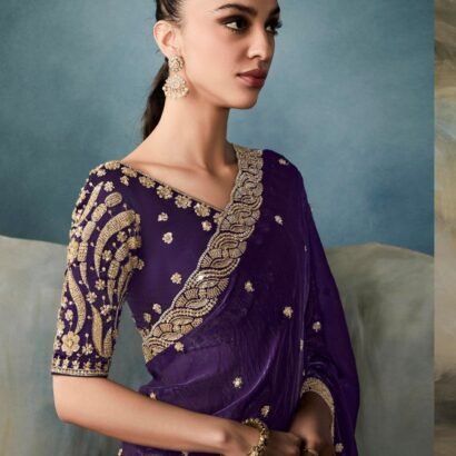 Dark Purple Tissue Contemporary Saree Wedding Wear Beads Work Saree With Blouse