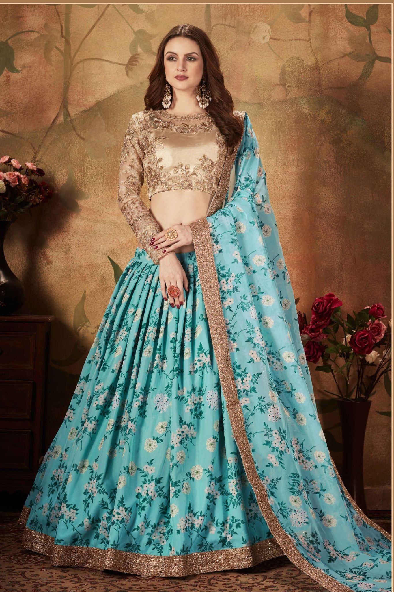 Be the first to review “Golden & Blue Floral Digital Printed Organza Party Wear Lehenga Choli”