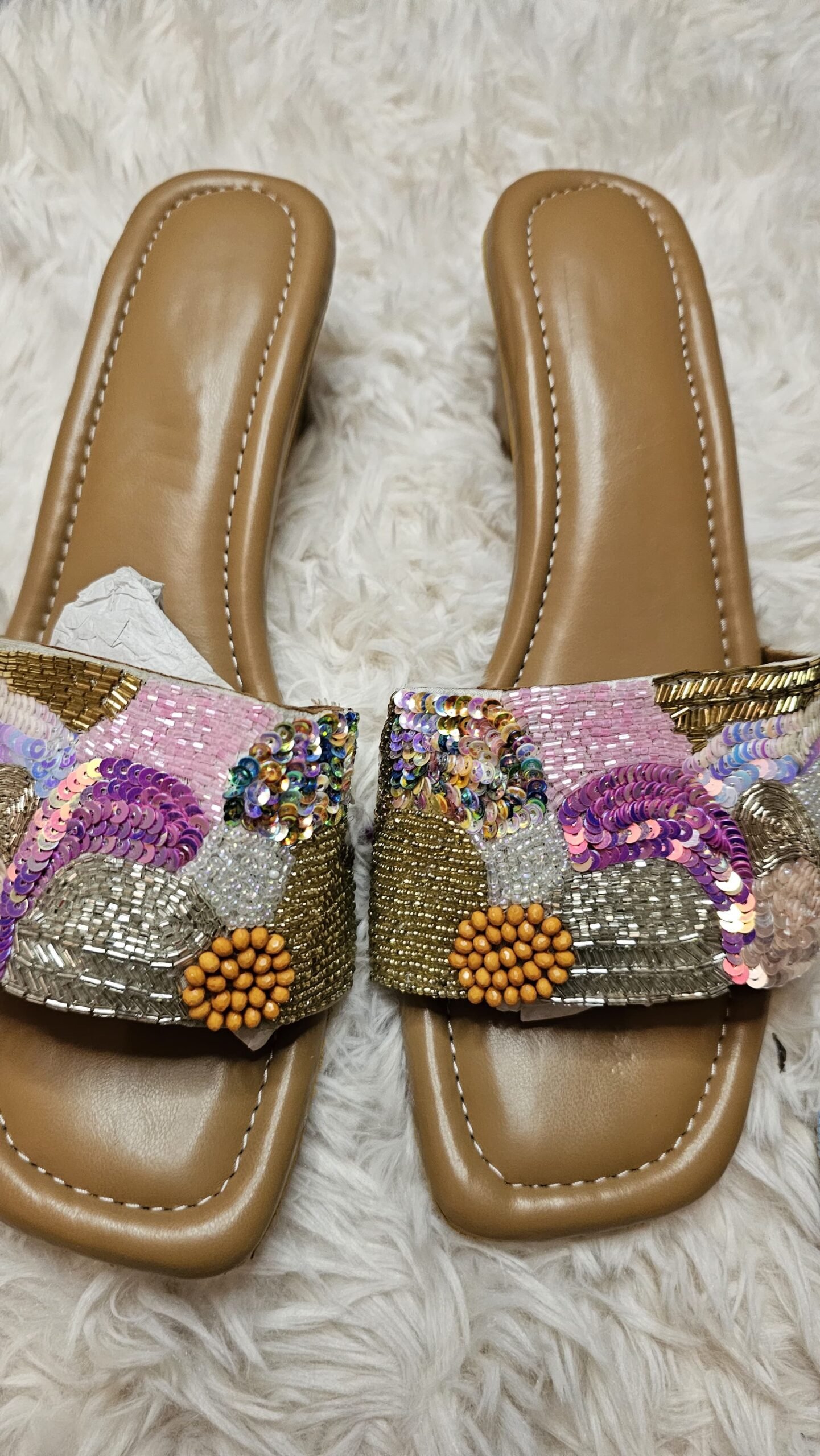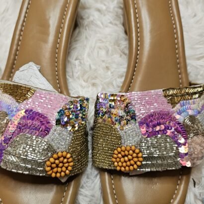 Hand embroidery with sequins, laces, beadwork wedge heel