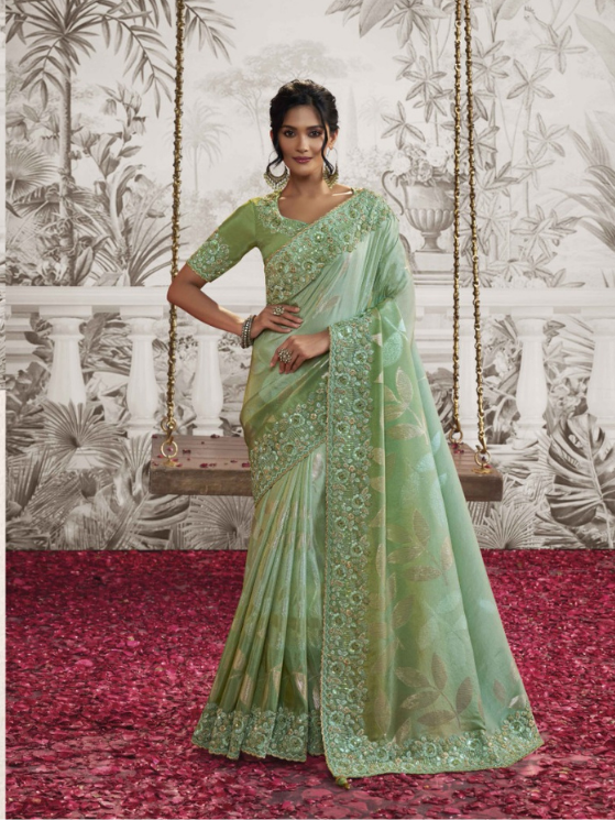 Light Green Soft Woven Embroidery Designer silk Saree With Matching Floral work blouse