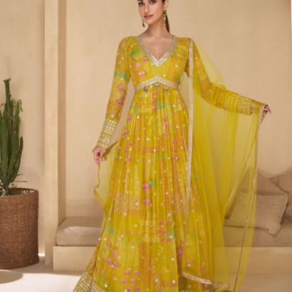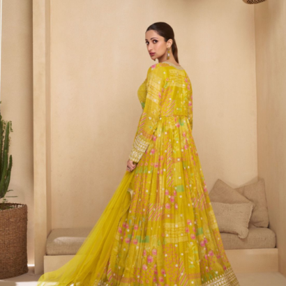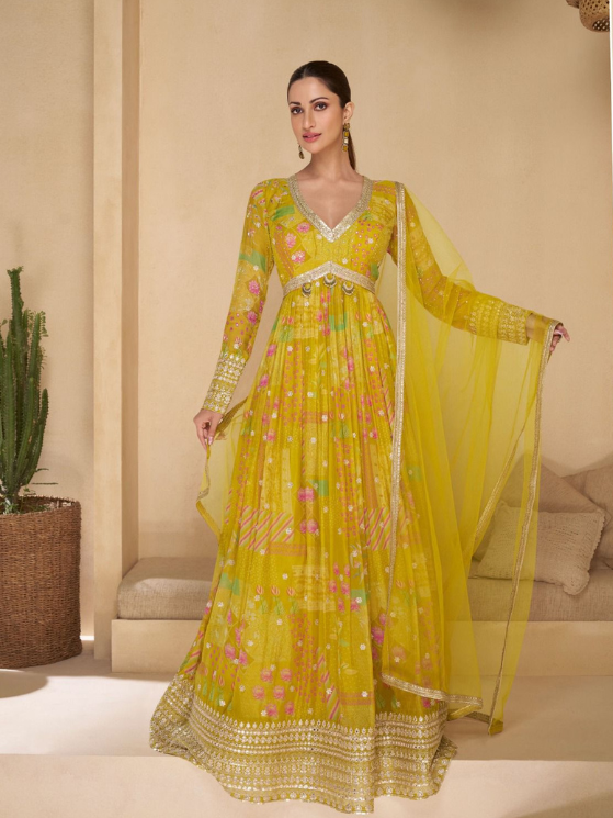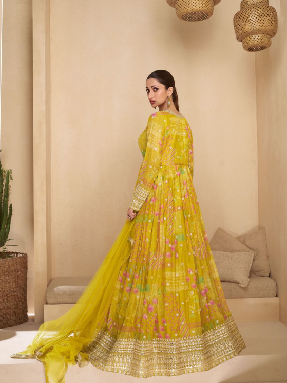 Lime Yellow Digital Printed Faux Georgette Gown With Dupatta