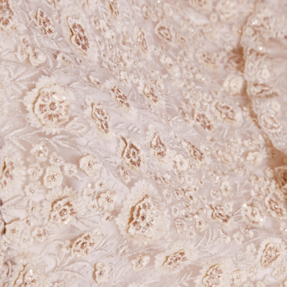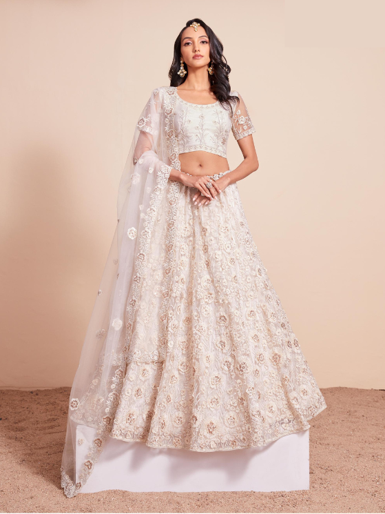 NET LEHENGA, DUPATTA & BLOUSE BEAUTIFULLY EMBROIDERED WITH, SEQUINS, THREAD AND ZARI WORK, ZARKAN AND HAND EMBELLISHMENTS DONE ALL OVER THE LEHENGA, BLOUSE AND DUPATTA.