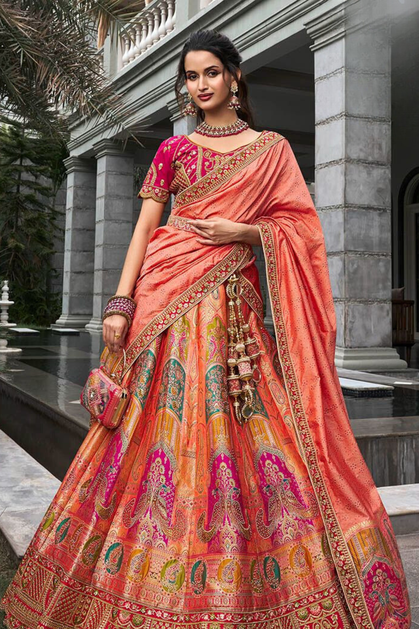 Peach & Coral Banarasi Silk Lehenga Choli with Zarkan Codding Work