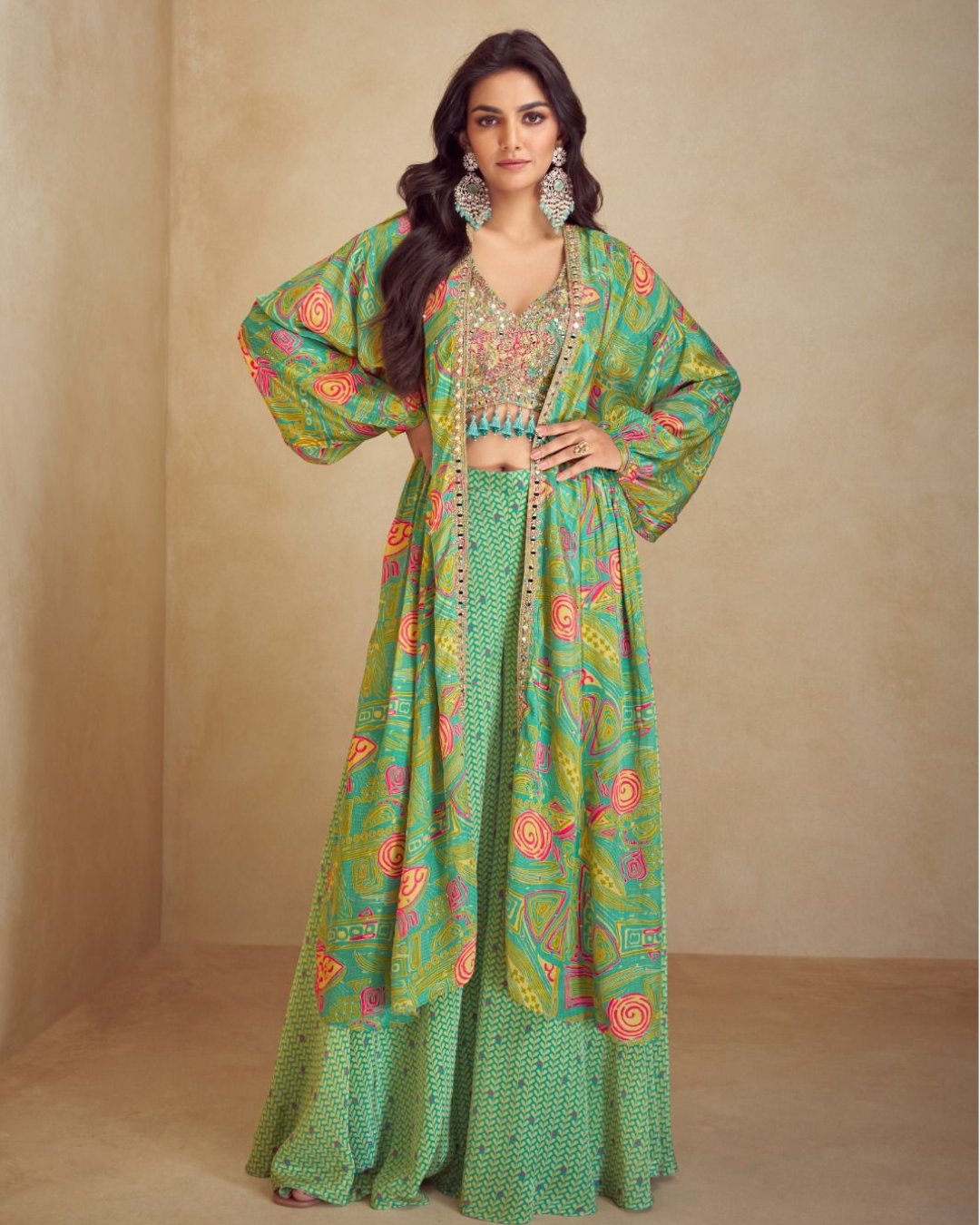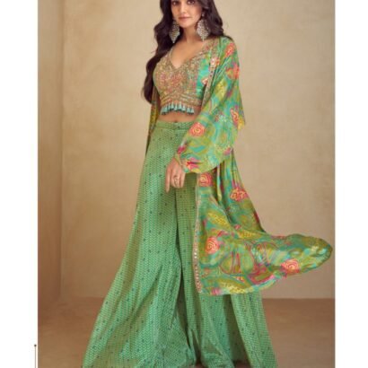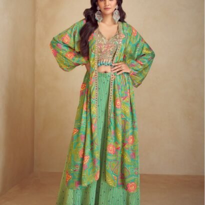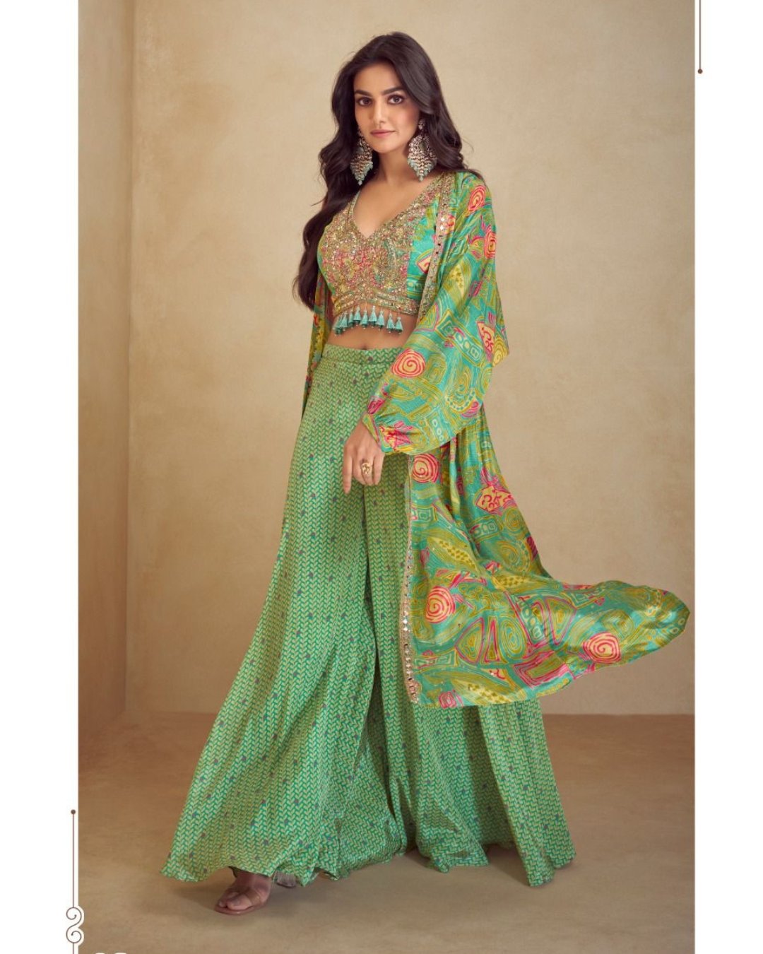 Printed light Green Designer Partywear Dress Real Chinon & Silk Digital Print Top & Palazzo