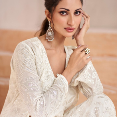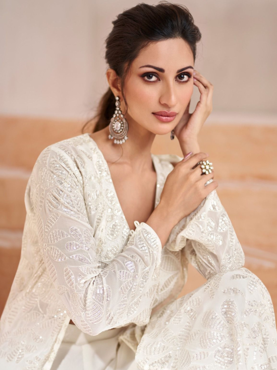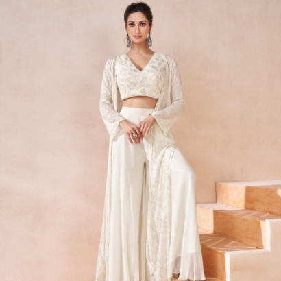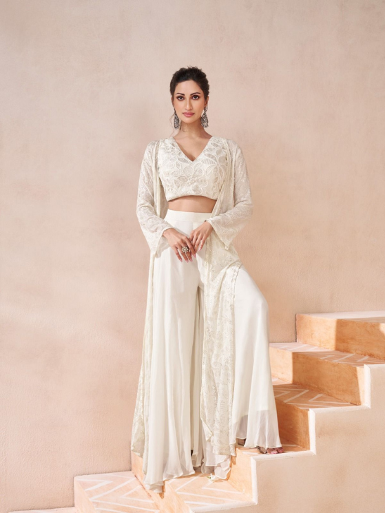 White Real Georgetta Embroidery choli with shrug and palazzo
