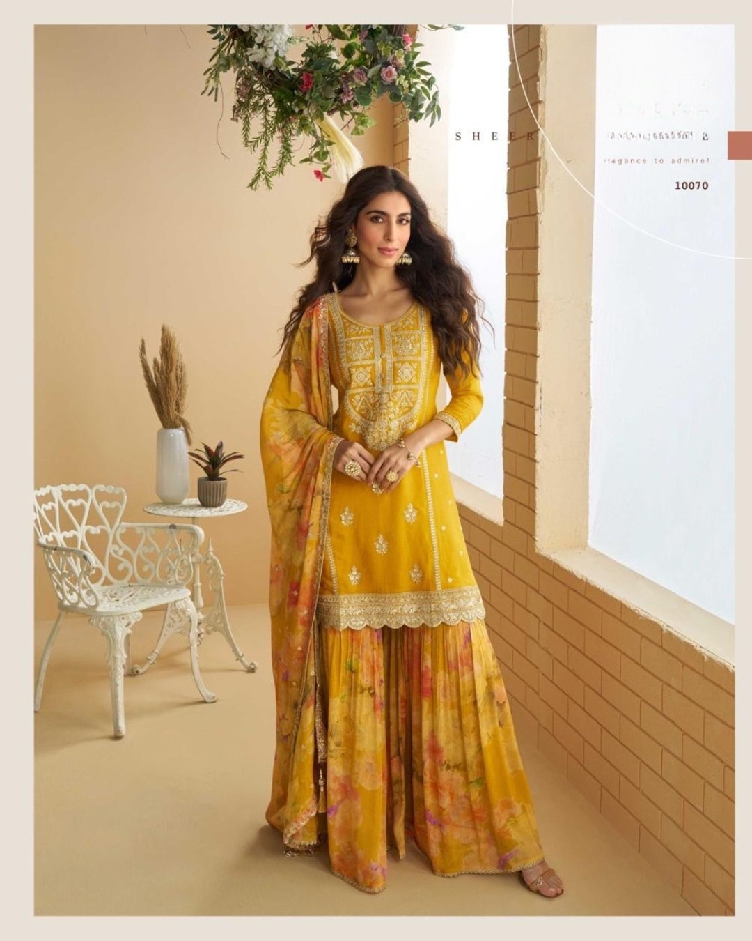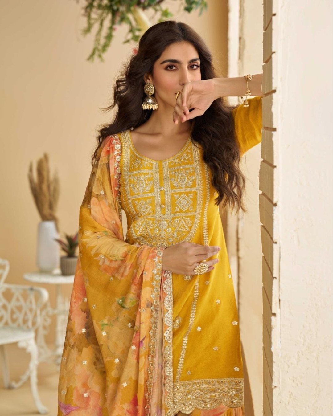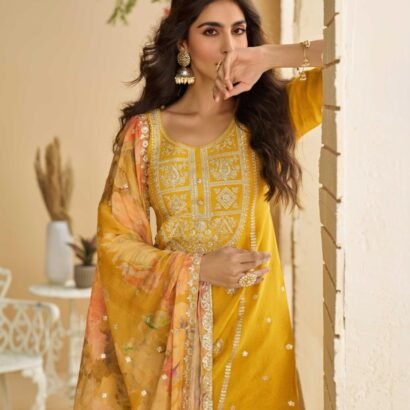 Yellow REAL PREMIUM CHINON SILK EMBROIDERED TOP WITH PLAZZO AND DUPATTA